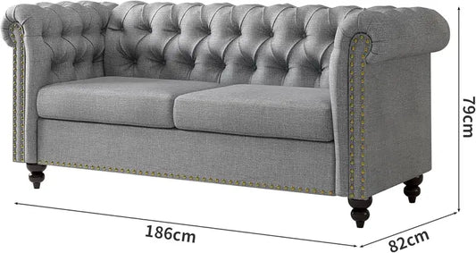 Chesterfield Grey 2 Seater Style Button back Sofa, Couch Linen Fabric Settee