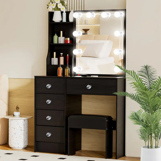 Dresser Vanity With Lights, 3 Light Colours, Black Dresser Set Vanity With 5 Drawers