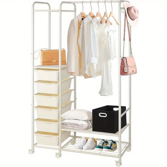 Wardrobe Clothes Rack With Wheels, Shoe Rack & Hanging Hooks For Hats And Bags