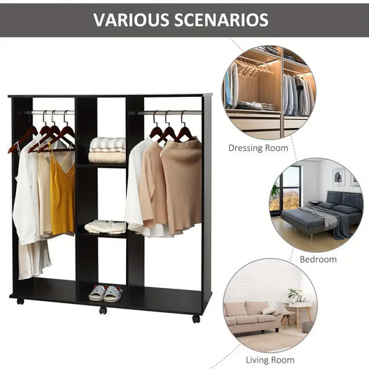 Wardrobe Double Open on Wheels, Bedroom Wardrobe with Clothes Hanging Rails, BLACK