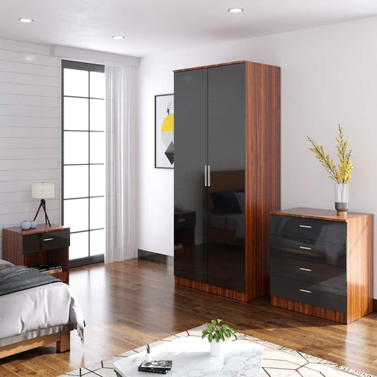 Wardrobe elegant 3 Piece Bedroom Furniture Sets High Gloss Soft Close ( BLACK & Walnut )