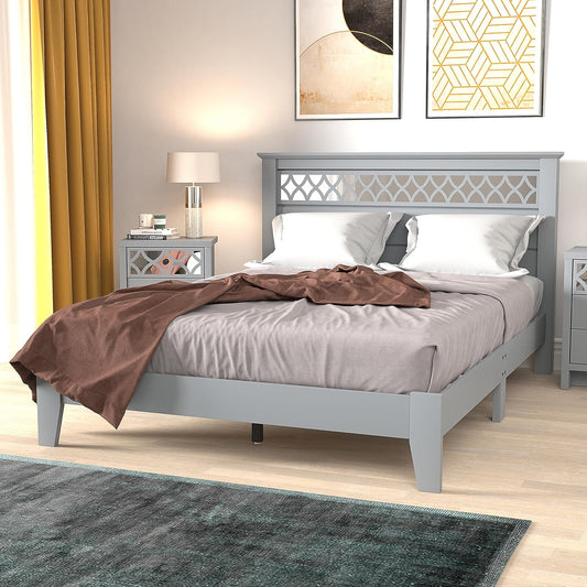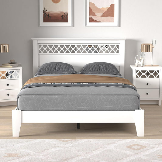 Wooden Double White Bed - Stylish Wooden Bedframe Mirrored Headboard