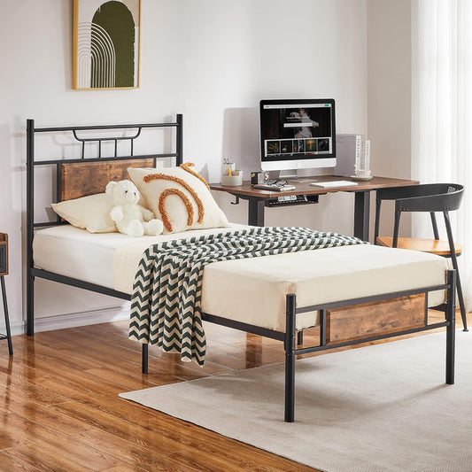 Metal Kids Single Bed Wood Headboard, Platform with Strong Metal Slats Support
