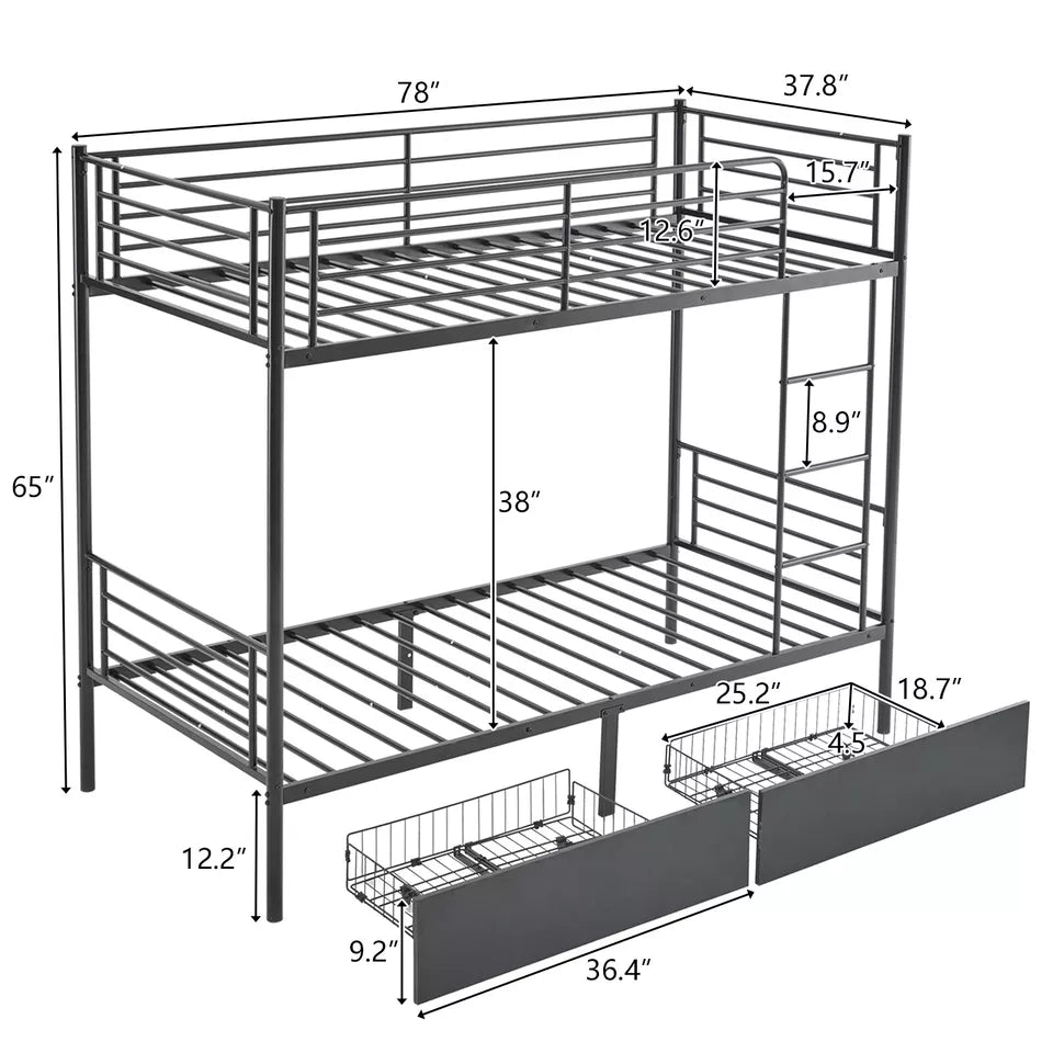 Experience the perfect combination of style and functionality with our Twin Over Twin Bunk Bed. Designed for kids, teens, and adults, this sturdy metal bunk bed maximizes bedroom space while providing a safe and comfortable sleeping environment. With its minimalistic line design, full-length guard rails, and a convenient ladder, it is not only a practical addition to any room but also adds a touch of modern elegance. Two large drawers with wheels under the bed offer additional storage space for a neat and organized bedroom.