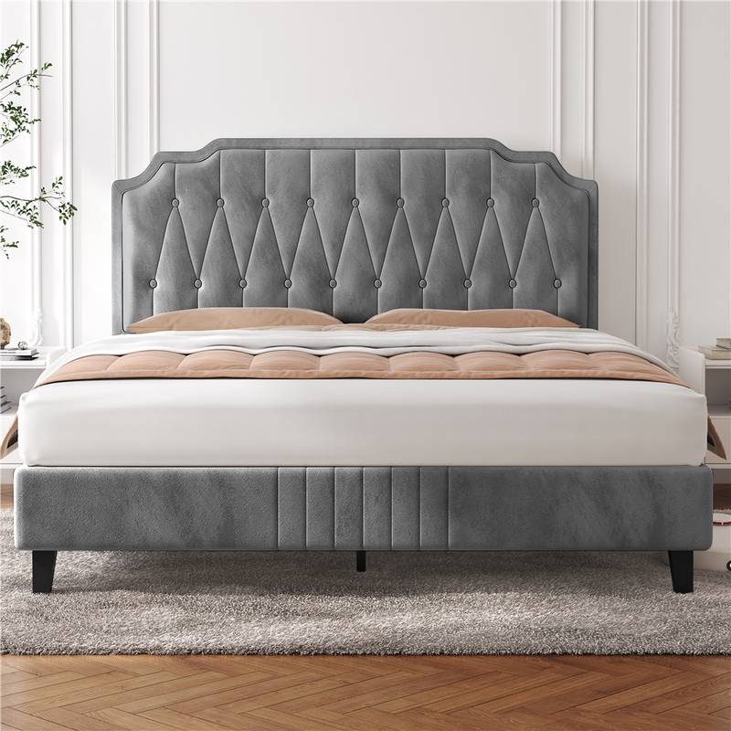 Chesterfield Upholstered Bed Frame Velvet (LIGHT GREY) Platform Bed with Height Adjustable Headboard With Wooden Slat Support